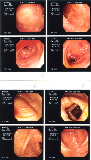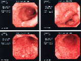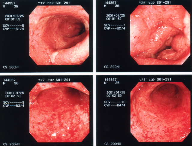 直腸からS状結腸までの様子。まだ、かなり下血していた時で、全体に赤や白の炎症がかなり目立つ。